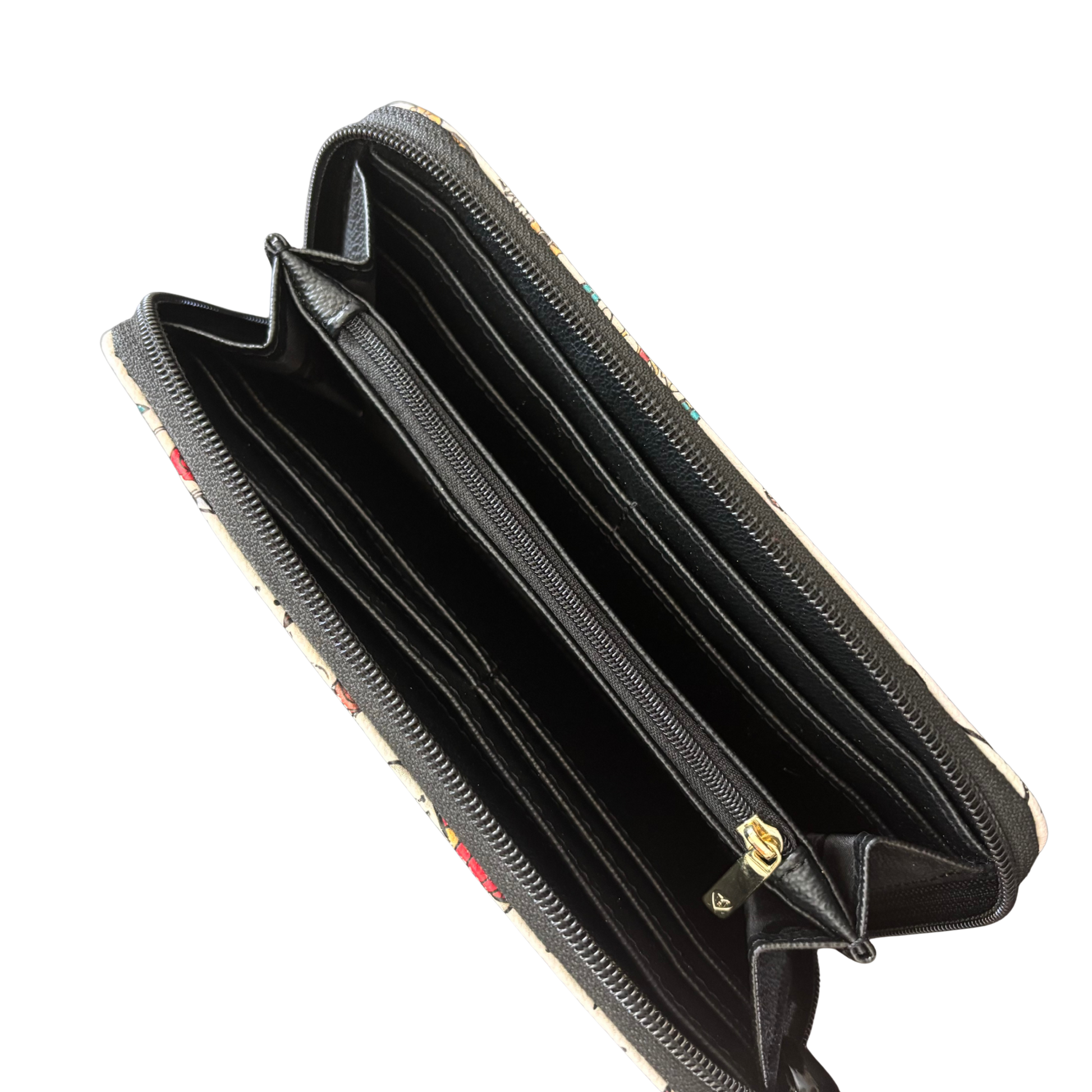 - Inside of the wallet features small center zipper pocket, 8 card pockets, and 2 large cash pockets on each side